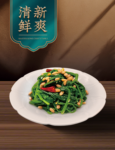 菠菜翠绿爽嫩,轻拌入味,松仁金黄酥香,点睛提味。