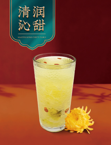 菊香清雅,融于雪梨的清甜与银耳的软滑之中。口感醇和爽滑,饮后唇齿留香,喉韵甘凉。